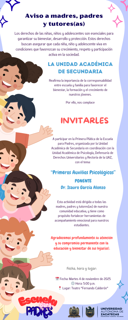A participar en la Primera Plática de la Escuela para Padres, organizada por la Unidad Académica de Secundaria en coordinación con la Unidad Académica de Psicología, Defensoría de Derechos Universitarios y Rectoría de la UAZ, con el tema: